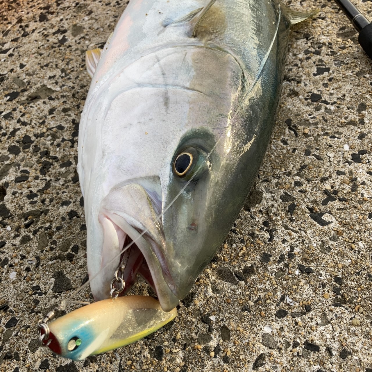 そして、青物ヒラマサのタイミング到来してました。ポッパー、ダイペンからのHAPPYRIDE100Fプロトの活躍。作成からほぼ10ヵ月ほどでかかりようやく初RIDEON。88㎝7Kほどのヒラマサ。天候や波の具合から、ウェイトのある太軸に交換。水面下を細かくドッグウォークさせつつバイトまで持ち込めました!